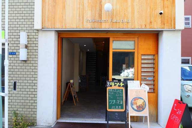 お店は「Tani-match Fuku b.l.d」という建物の1階にあり、外にはスパイスカレーの写真が入ったdahliaのボードが出ています。