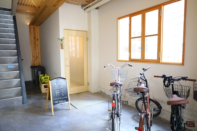 建物の中、お店の入口の前には駐輪スペースがあり、自転車で来店した方の自転車が並んでいます。