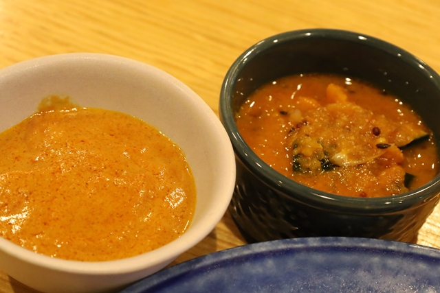 今回は一番のおすすめである「3種合いがけカレー」(1,400円)をオーダーしました。この日のカレーは、「大山鶏のカレー」(本日のスパイスカレー)、「カボチャカレー」(近郊野菜のカレー)、そして「バターチキンカレー」の3種構成でした。
