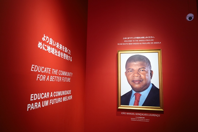パビリオンに入ると、まず目に入るのは「健康教育」の文字と、アンゴラ共和国のジョアン・ロウレンソ大統領の写真。