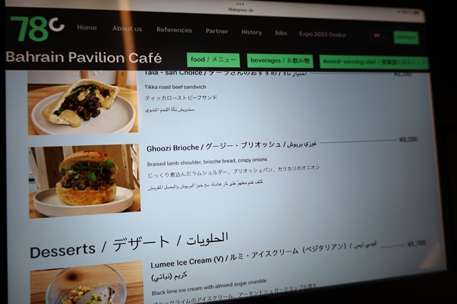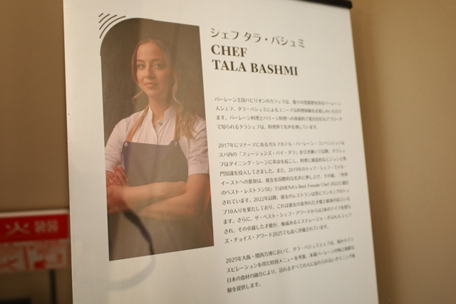 運営は、万博会場でルクセンブルクやドイツ、クウェートのパビリオンも手がける78degrees goes Japan社。そのカフェで提供される料理は、数々の国際的な賞を受賞したバーレーンのトップシェフ、タラ・バシュミ氏が監修しています。