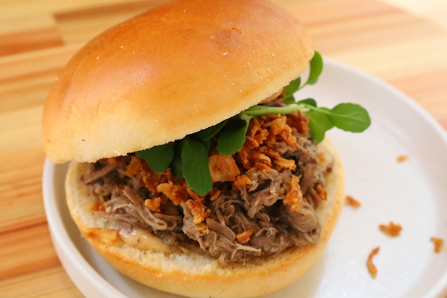 じっくり煮込まれたラムショルダーを、ふんわりとしたブリオッシュパンで挟んだ一品です。