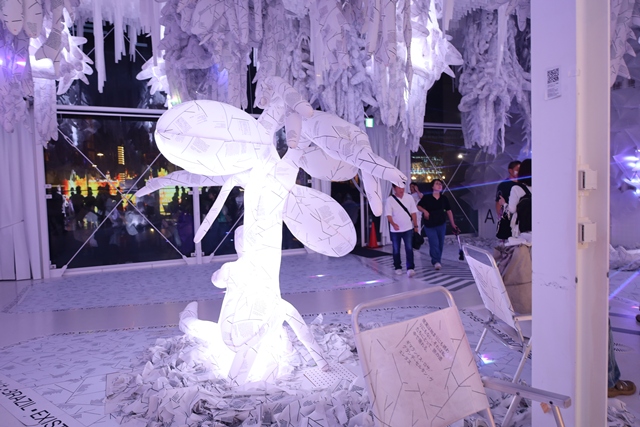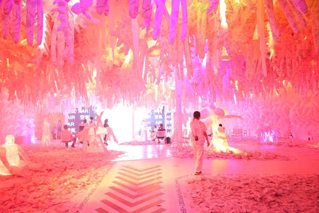 木やリサイクルされたポリ袋で作られたオブジェが、不思議なアート空間を作り出しています。