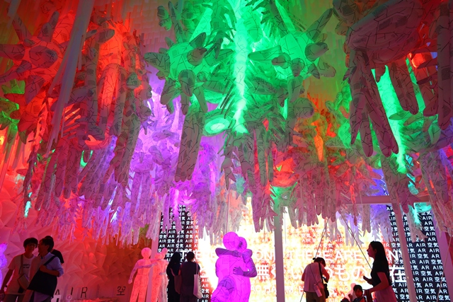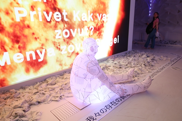 ブラジル館のテーマは、「自然との共存」と「環境と人間との関わり」です。木やリサイクル素材でできたオブジェが、生命の多様性、死と再生の物語を紡いでいます。