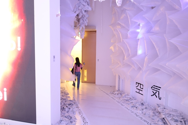 内部の光で色鮮やかに輝いた後、再び白い空間に戻り、LEDライトの光線が会場を横切ります。これは、すべてのものが相互につながっていることを表現しているそうです。