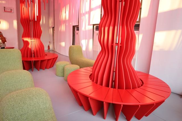 天井から垂れ下がる赤と白の細い棒が独特な雰囲気を作り出しています。