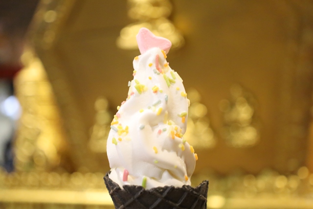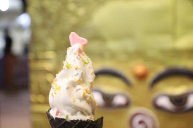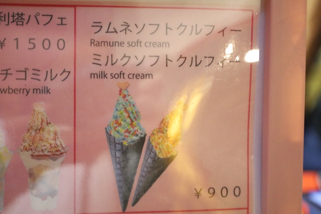 日本人スタッフの方にどちらがおすすめか聞いてみたところ、1,500円の「仏舎利塔ソフトクルフィーパフェ」とのこと。チョコレート、イチゴミルク、キャラメル、抹茶ミルクの4種類があり、どれも美味しそうです。