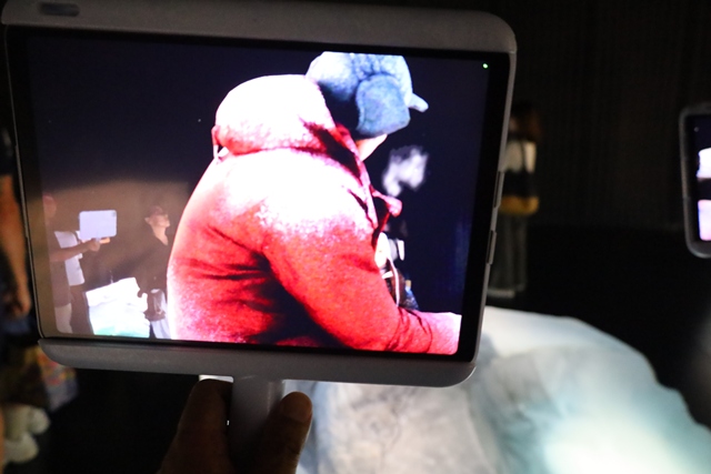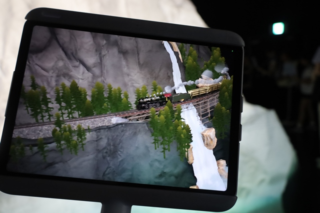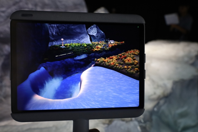 パビリオンに入ると、まずハンディタブレット型の拡張現実(AR)デバイスが手渡されます。これは、まるで大きな横長の虫眼鏡のような形をしています。