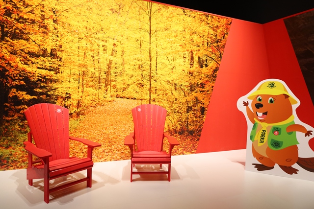 ショップの反対側には、美しい紅葉の背景をバックに記念撮影ができるスポットも用意されています。カナダといえばやっぱりメイプル!旅の思い出に、赤い椅子に座って撮影しましょう!