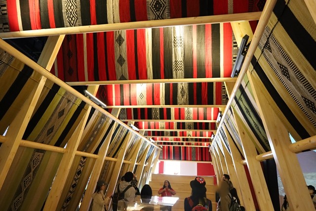 パビリオンの主役は、何と言ってもこの巨大な織物「マクン」です。先住民族マプチェの伝統的な織物文化を現代に伝えるこの作品は、そのスケールに圧倒されます。