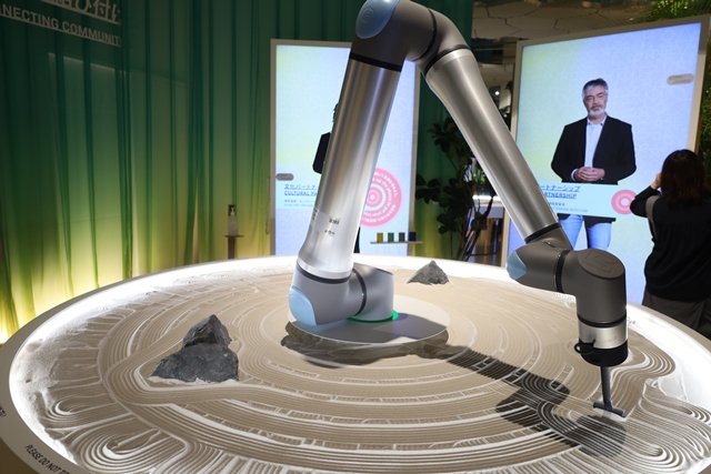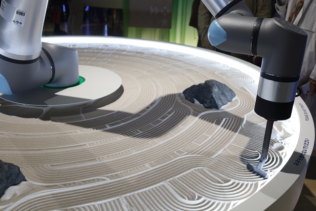これは、ロボットアームが日本の伝統的な庭園様式である枯山水を自動でお手入れするというユニークな展示です。