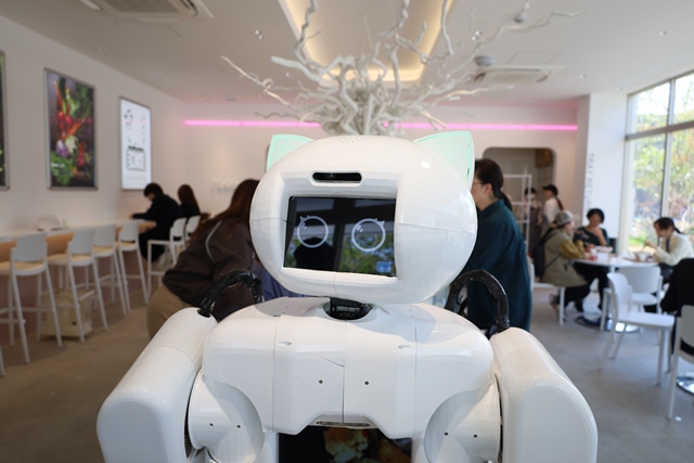 お店の入り口では、ロボットがお出迎えしてくれます。まるで未来の世界にいるかのような体験に、ワクワクします。