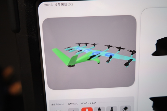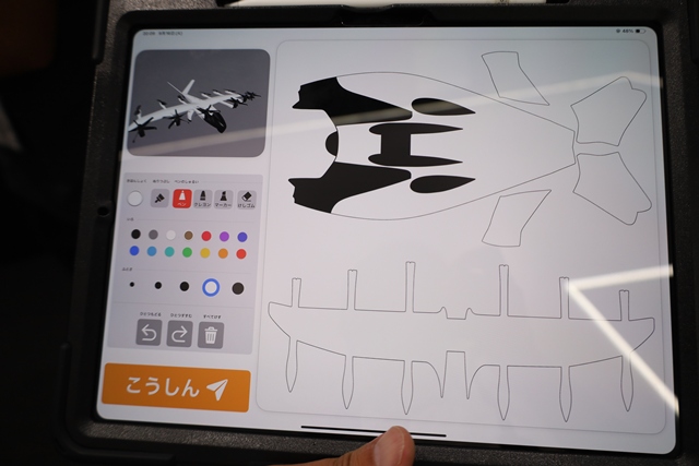 まず、待ち時間にはタブレットで自分だけの「空飛ぶクルマ」をデザインします。