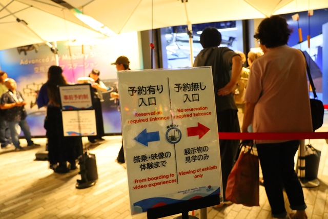 パビリオンの入り口は、向かって左が事前予約者用、右が自由入場者用になっています。予約なしでも「空飛ぶクルマ」の機体を見学・撮影することはできますが、それだけではもったいない!