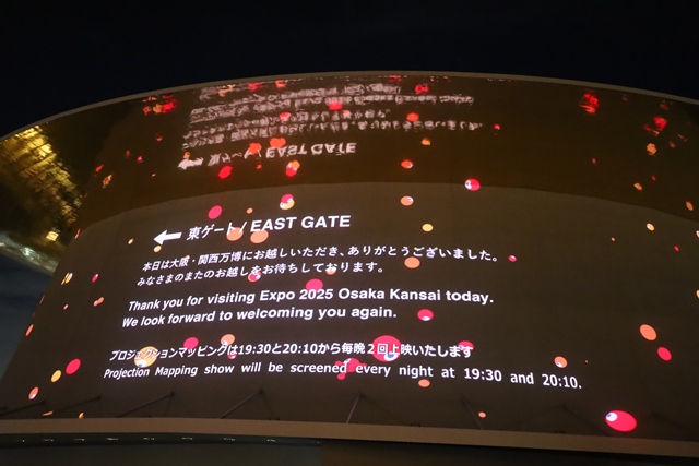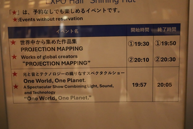 このプロジェクションマッピングは、シャインハット前の屋外広場で自由に観覧できます。予約も不要なので、万博を楽しんだ一日の終わりに、ぜひ立ち寄ってみてください。万博の最後に観るプロジェクションマッピングは、忘れられない感動的な思い出となること間違いなしです。
