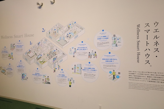 この家の前には、ウェルネス・スマートハウスに関する解説展示が壁にあり、家が持つ機能やコンセプトを事前に知ることができます。