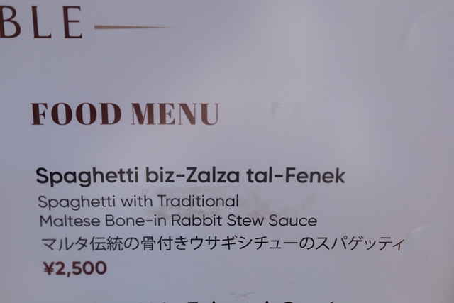 楽しみにしていた一番人気の「マルタ伝統の骨付きウサギシチューのスパゲッティ」(2,500円)を注文しました。