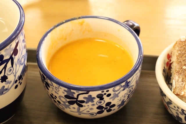 1. トマトスープ 最初はトマトスープ。酸味が効いたさっぱりとした味わい。熱々を想像していたのですが、少し温度が低かったため、素材の風味が閉じ込められているように感じました。
