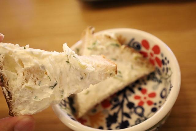 ここでようやく、ほっと一息つける味に出会いました。ライ麦の酸味があるサワードウブレッドに、パセリとディルが入ったハーブクリームチーズがたっぷり。これまでの料理とは異なり、落ち着いた味わいでとても美味しかったです。