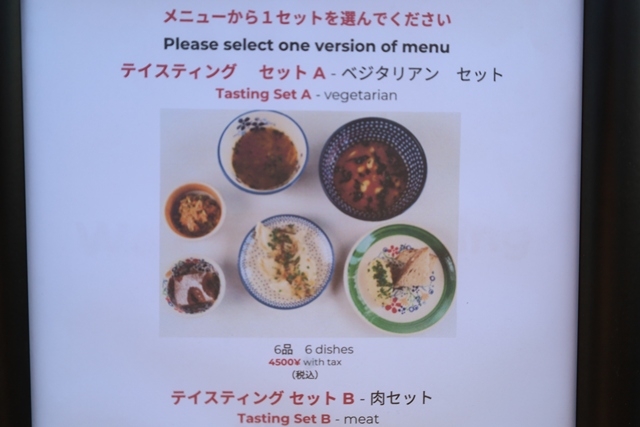 ベジタリアン向けのセットAと、肉料理が楽しめるセットBがあり、どちらも6品ついて税込4,500円です。