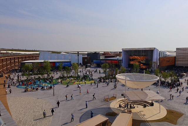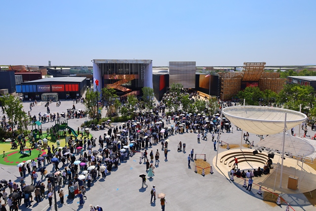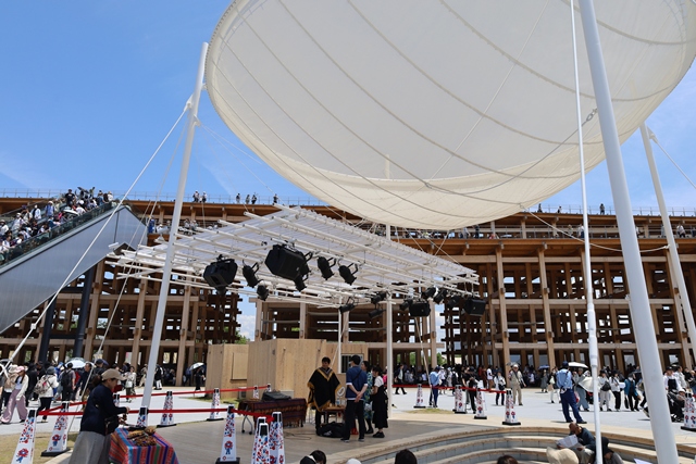夢洲駅から東ゲートをくぐり、壮大な木造の大屋根リングを抜けると、目の前に広がる光の広場の真ん中に、ステージがあります。