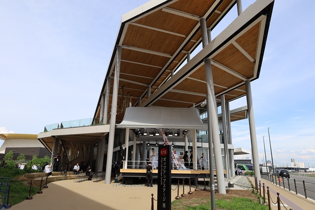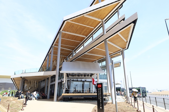 ポップアップステージ南は、EXPO ナショナルデーホールの一部で、レイガーデン1階の端に位置しています。最大の特徴は、何といっても海を背景にした美しいロケーション。そのランドスケープは、まるで一枚の絵のよう。設計は株式会社安井建築設計事務所と株式会社平田晃久建築設計事務所が手がけており、鉄骨造と木造を組み合わせた温かみのあるデザインが魅力的です。