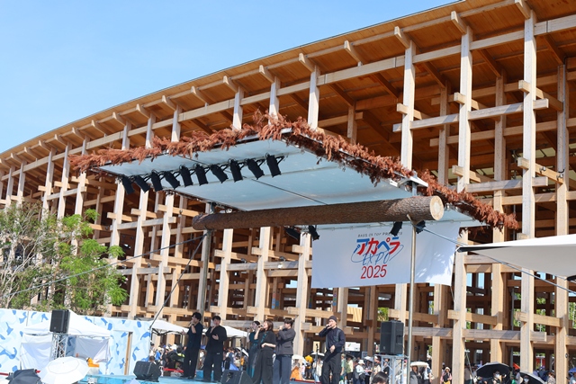 さらに、屋根には松葉葺きが施されており、シンプルでありながらも、お祭りという特別な場にふさわしい、どこか懐かしくも新しい「原初性」を感じさせます。約50.4m²(W7,200xD7,200)のコンパクトな舞台は、訪れる人々に一体感と親密さをもたらします。
