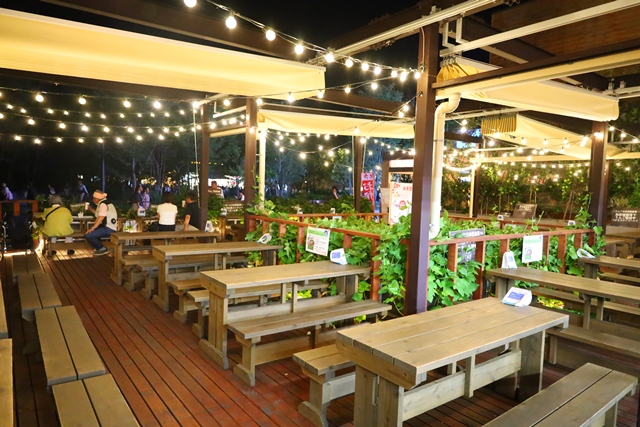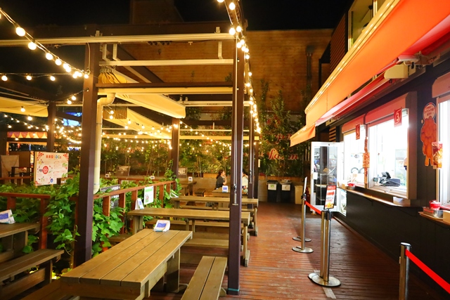 広々とした店内には屋根付きのテラス席も完備。昼間は開放的な雰囲気、夜はライトアップされてまた違った表情を見せるので、時間の流れとともに楽しめました。