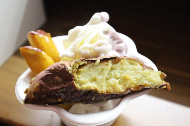 紅芋とバニラのミックスソフトクリームは、なめらかで風味豊か。その上には、とろけるような焼き芋と大学芋が贅沢にトッピングされていて、食べ応えも抜群。このパフェ一つで、らぽっぽのこだわりとおいしさを存分に感じられました。