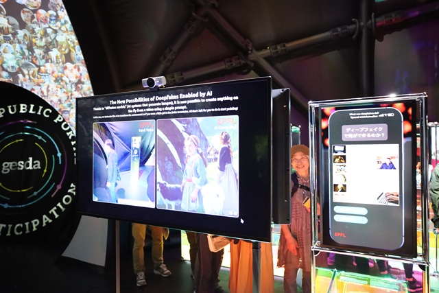 さらに進むと、AIのディープフェイク体験が待っています。カメラの前に立つと、数秒で自分の顔がスイスの民族衣装を着たハイジ風の少女に大変身!背景にはアルプスの絶景が広がり、来場者はみんな笑顔で楽しんでいました。