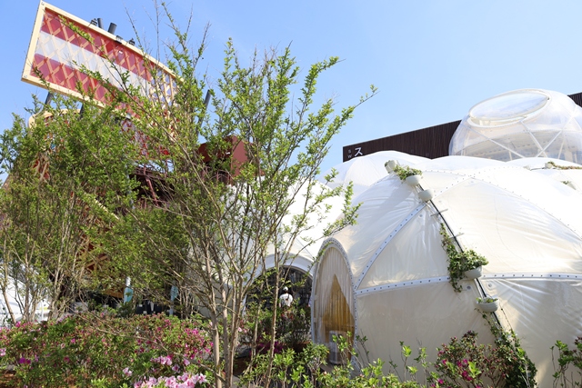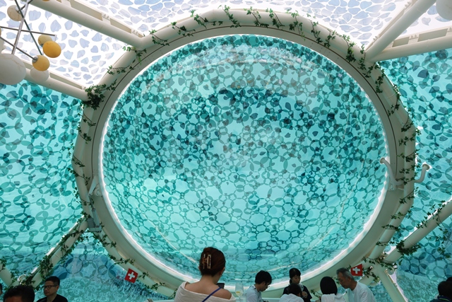 「スイスパビリオン」に近づくと、まずその外観に驚かされます。球体が連なったようなデザインは、環境に優しい軽量膜構造という素材でできており、実際に触ってみるとテントのような柔らかい質感を感じます。