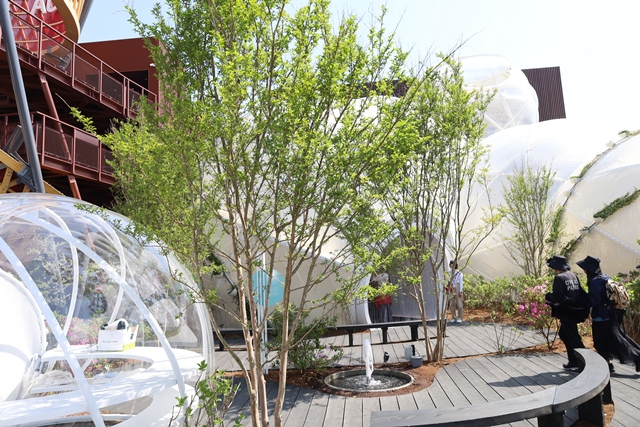 開催直後の春は開放的な空間で、万博会場を一望できましたが、夏になり日差しが強くなったため、夏は日よけが設置されています。