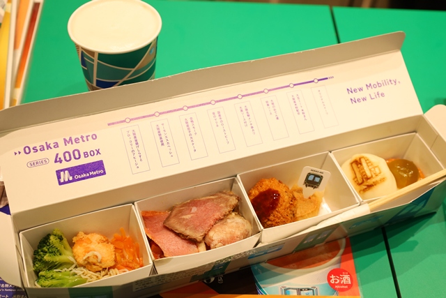 18時から販売される「リボーン夜市セット」は、ランチボックスとドリンクが1つ付いて、税込2,000円!しかも、その内容が充実しており、長い列車型のボックスの中には、ビールのおつまみにぴったりの料理が4つに分かれて入っています。テイクアウトしてリボーンテラスで食事が楽しめます。