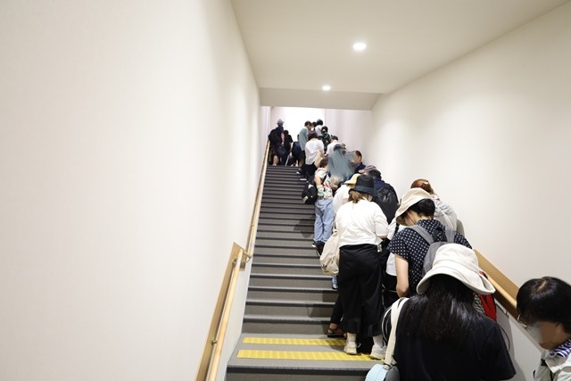 レストランを利用するためには、2階から続く階段の右側に並んで順番を待つ必要があります。万博会期中は人気のパビリオンで、レストランの行列も必至。でもご安心ください。室内で並ぶので、外の暑さをしのいで涼しい中で待つことができます。