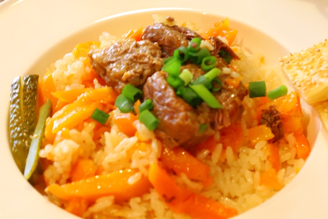 スタッフの方にRESTAURANT SUPRAで一番のおすすめを聞いたところ、即答で返ってきたのが、一番人気の伝統的なトルクメン米料理「パロウ」(3,450円)。