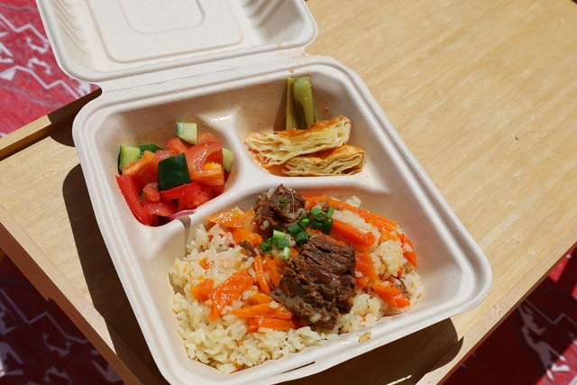 バスマティライスを甘いニンジンと香ばしいタマネギと一緒に炒めた、優しい味わいの料理です。その上に、とろけるほど柔らかく煮込まれた牛肉がごろっとのっていて、食べ応えも抜群。つけ合わせには、常温のトマトときゅうりのピクルスと、パンのスライス。素朴ながらも、どこか懐かしさを感じる温かい味わいです。スタッフの方いわく、家庭や地域によって少しずつ味が違う、トルクメニスタンではおふくろの味のような存在だそうです。