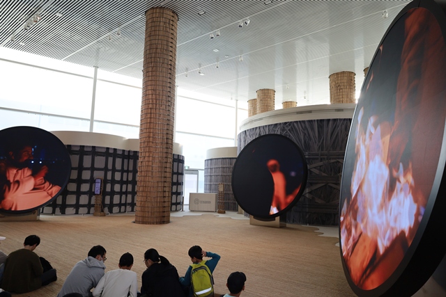 展示は柱の周辺に点在しているので、決まった順路はありません。自分の興味のあるところを自由に散策できるのが、このパビリオンの大きな魅力です。