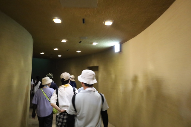 さらにスタッフが建物のコンセプトを説明してくれます。この建物は、日本の資材とウズベキスタンの建築様式を融合させたもので、入り口付近の土壁は淡路島の職人が手がけたそうです。薄暗いこの空間は、私たちが「種」であることの表現で、地下をイメージしているのだとか。