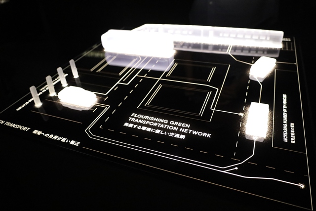 環境負荷の低い輸送システムが、未来の都市像として描かれています。