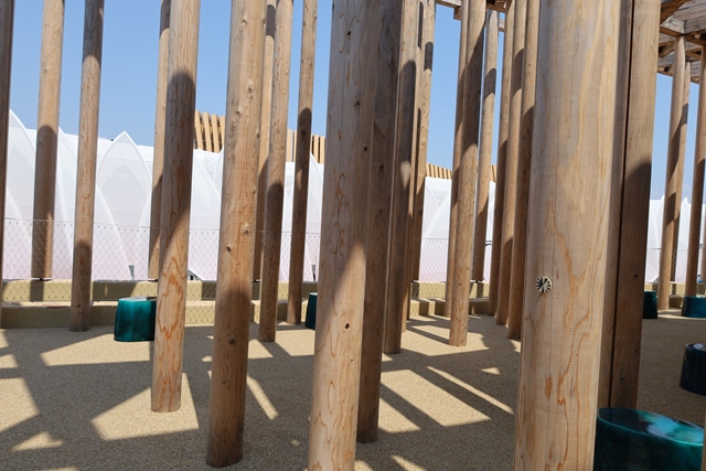 モスクの建築デザインを取り入れた、たくさんの木の柱に囲まれた空間が広がっています。