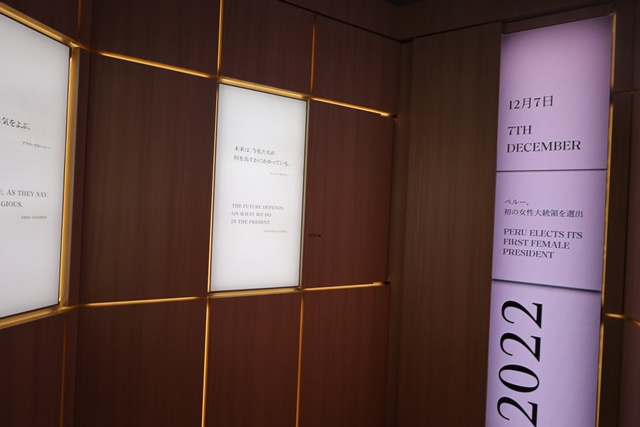 しかし、パビリオンはそこで終わりません。未来に向けた希望のメッセージが、著名な格言や、女性の活躍に関するニュースとともに力強く語りかけられます。
