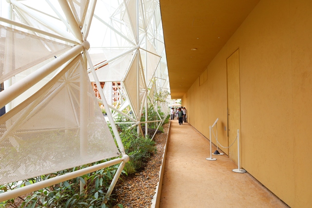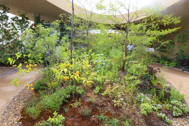 階段を上り切ると、景観デザイナーの荻野寿也氏が手がけた「UPPER GARDEN」が広がっています。大阪の樹木で構成されたこの庭は、万博後もまた大阪の山々に戻されるという、サステナブルな取り組みがなされています。