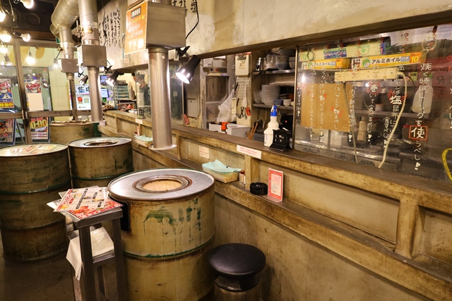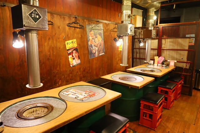 席の中央には本格的なかんてき(七輪)が設置され、その上にはしっかりとしたダクトが完備されているため、煙の心配も最小限に抑えられています。