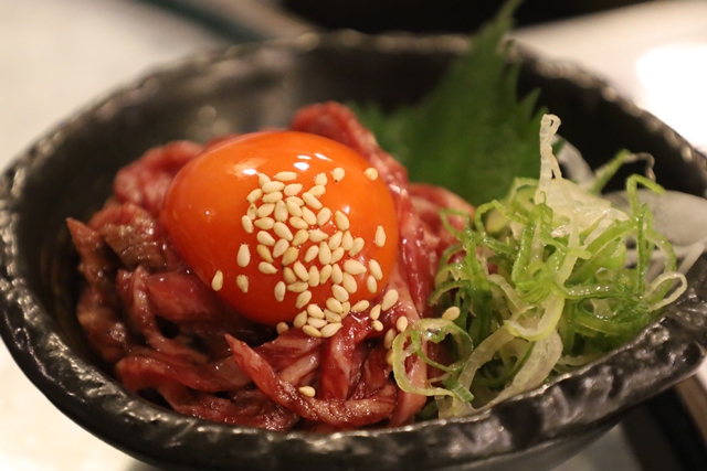 最初に注文したいのが「特選レアユッケ」。濃い黄身が特徴の大分県産 蘭王卵をユッケに絡めていただく一品です。口の中でとろけるような食感と、たっぷりの旨みが最高で、このクオリティで1,078円という高いコストパフォーマンスにも驚きです。