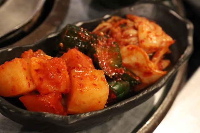 白菜、胡瓜、大根のキムチが楽しめる「キムチ盛り合わせ」も箸休めに最適。甘みと辛さが絶妙で、特にカクテキ(大根)のシャキシャキとした食感が楽しめます。
