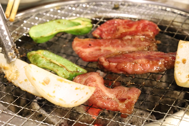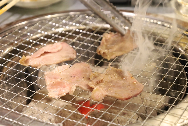 七輪で最初に焼くのは「ごっつタン塩」。鮮度の良い豚タンを、特製の旨ネギと一緒にいただきます。薄切りで食べやすく、すぐに焼き上がるため、ビールとの相性も抜群です。