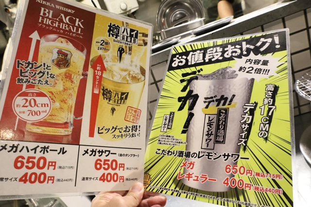 豪快に飲みたいなら「デカサイズ」が正解! ドリンクメニューも豊富ですが、特筆すべきはジョッキのサイズ。ハイボール、レモンサワーなど、通常の2倍以上はある「メガジョッキ」も選べるんです。