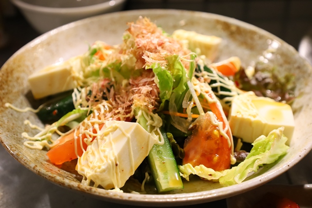 レタス、キュウリ、トマト、豆腐のヘルシーなサラダ。シャキシャキで美味しい!