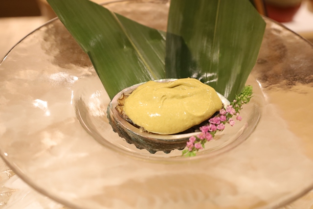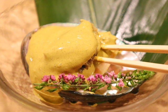 アワビの肝ソース。 4時間かけてじっくり煮込まれたアワビは、驚くほど柔らかく、噛むたびに旨みが広がります。