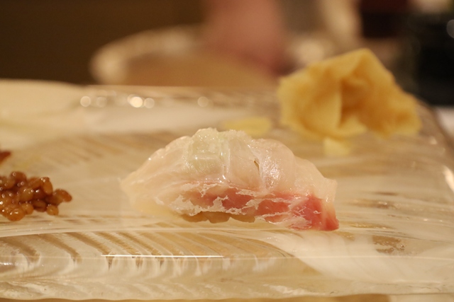 鯛の昆布締め。昆布の旨みがしっかり移った鯛は、上品な甘みがあり、奥深い味わい。シャリは京都の老舗「八代目儀兵衛」の米を使った赤酢のシャリで、ネタの旨みを存分に引き出していました。